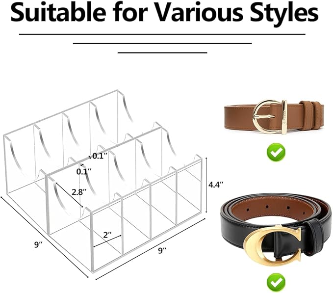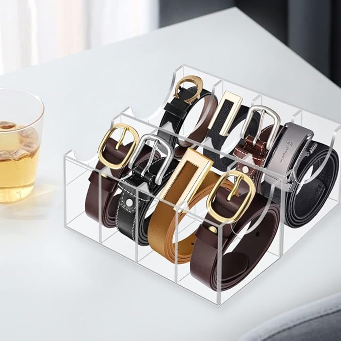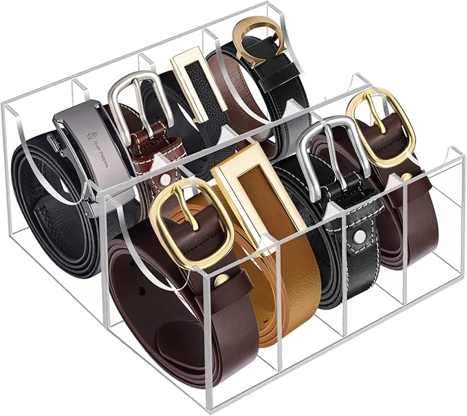 Belt Organizer Acrylic 8 Compartments Belt Container Storage Holder, Acrylic Belt Display Storage Box, Clear Belt Display Case for Closet Tie and Bow Tie Watch Jewelry Bracelets Ring.
