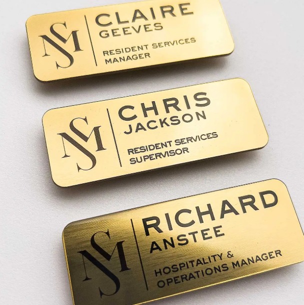 Combining the timeless appeal of stainless steel with the refined elegance of gold, Domecraft’s name badges offer a luxurious aesthetic that elevates any professional attire. Each badge features precise engraving techniques that ensure clarity and crispness, providing a polished finish that reflects your brand’s dedication to excellence. Whether in client meetings, conferences, or day-to-day business settings, our badges are designed to make your team shine.